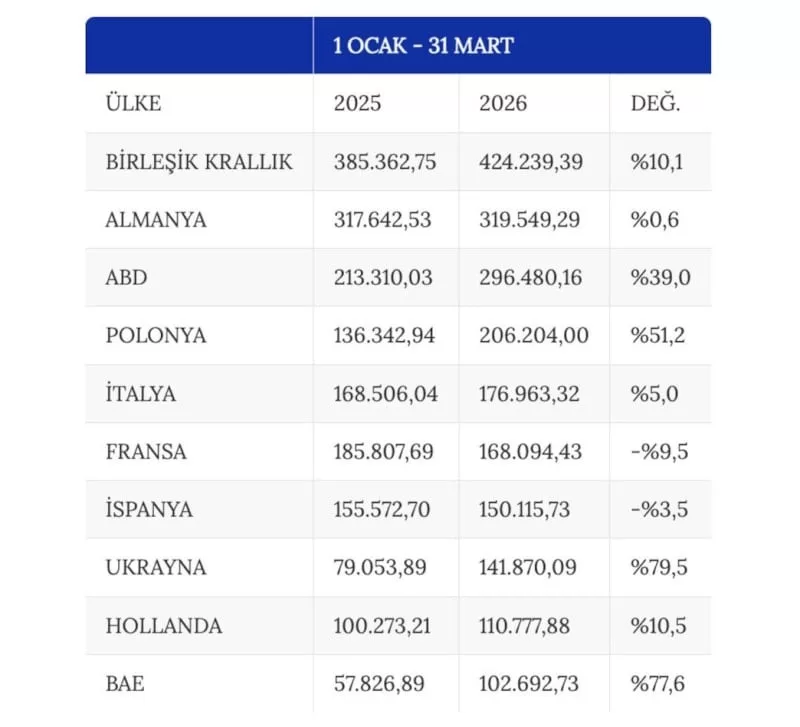 TİM verilerine göre geçen yıl ve 2026’nın ocak-mart dönemi elektrik ve elektronik sektörünün en fazla ihracat (bin dolar) gerçekleştirdiği ülkeler şöyle:
