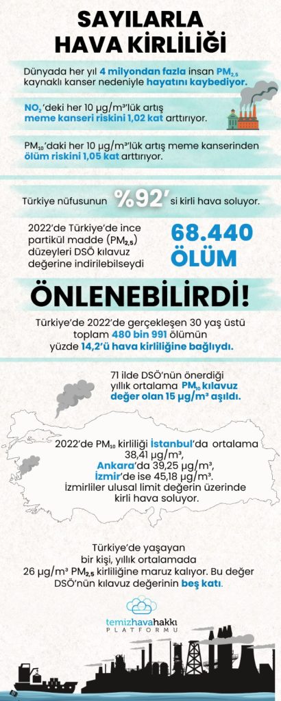 Kara Rapor 2024’ün en çarpıcı vurgularından biri, hava kirliliğiyle meme kanseri arasındaki ilişkinin ortaya konması. Dünyada meme kanseriyle hava kirliliği arasındaki ilişkiye işaret eden bilimsel araştırmaların sayısının giderek arttığına dikkat çeken raporun yazarlarından halk sağlığı uzmanı Prof. Dr. Gamze Varol şunları kaydetti:“P10 ve PM2,5 ile birlikte hava kirliliğinin önemli bir bileşeni olan NO2’deki (azot dioksit) her 10 μg/m3’lük artış, meme kanseri riskini 1,02 kat artırıyor. Her 10 μg/m3 PM10 artışıyla meme kanserinden ölme riski 1,05 kat artıyor. ABD’de yapılan bir araştırmaya göre ise PM2,5’a daha fazla maruz kalınan bölgelerde yaşayanlarda meme kanseri vakalarında yüzde 8’lik bir artış gözlemlendi.”Raporda ayrıca şu bilgilere yer veriliyor: Egzoz dumanı solumak meme kanseri riskini artırıyor. Fransa’da yıllık meme kanseri vakalarının yüzde 3,15’i, ana kaynağı trafik olan NO2’ye atfediliyor. Bu artışın maliyeti yıllık 825 milyon euro.