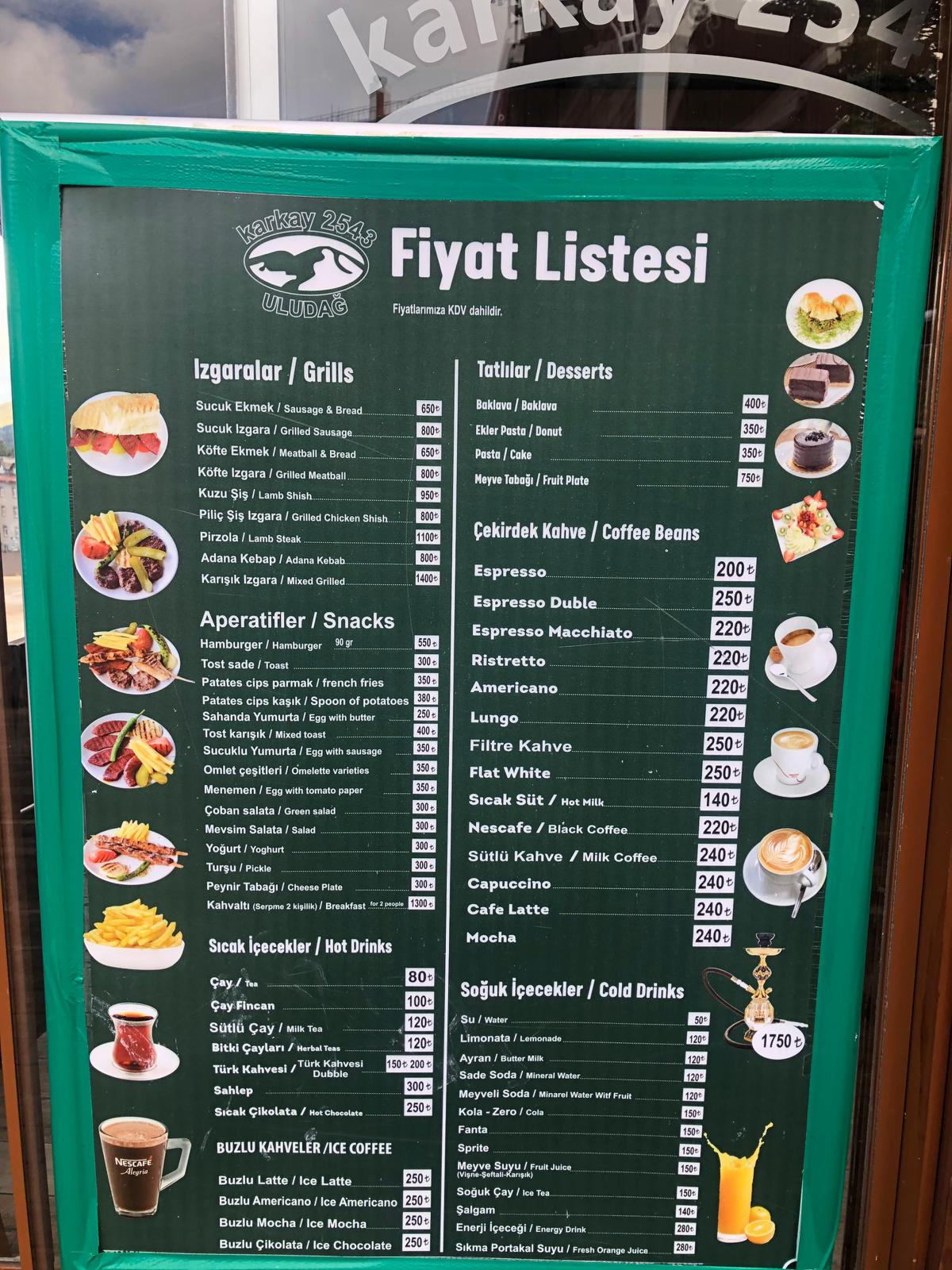 Uludağ’da klasikleşen sucuk ekmek ve köfte ekmek 650 liradan satılırken, ızgara çeşitleri 800 lira, kuzu şiş 950 lira, pirzola ise 1100 liraya kadar çıkıyor. Hamburger 300, karışık tost 400, menemen 350, iki kişilik serpme kahvaltı 1300, meyve tabağı ise 750 liradan sunuluyor.
