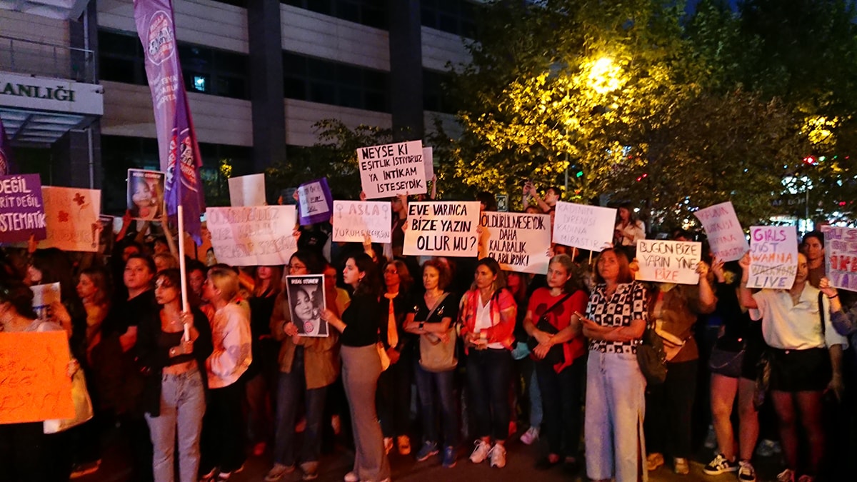 Aslında biz bugün Beyoğlu’nda eylem yapmayı planlıyorduk. Sonra maalesef ki İkbal ve Ayşenur’un öldürülmesi üzerine burda eylem yapma kararı aldık. Herkes Beyoğlu’ndakini izledi değil mi o kamera kayıtlarını? İstanbul’un en işlek ilçesini, sokaklarında 2 erkek bir kadın arkadaşımızı taciz ediyor. Sonra öğrendik ki o video yeni değilmiş, o kişiler zaten serbest bırakılmış… Sosyal medyada gündem olmasının ardından tekrar gözaltına alındılar. Ve sonra yine öğrendik ki taciz olmak üzere birkaç suçtan zaten sabıkaları varmış. Ve buna rağmen dışardalar. Buna rağmen Beyoğlu sokaklarında bir kadına saldırabiliyorlar.