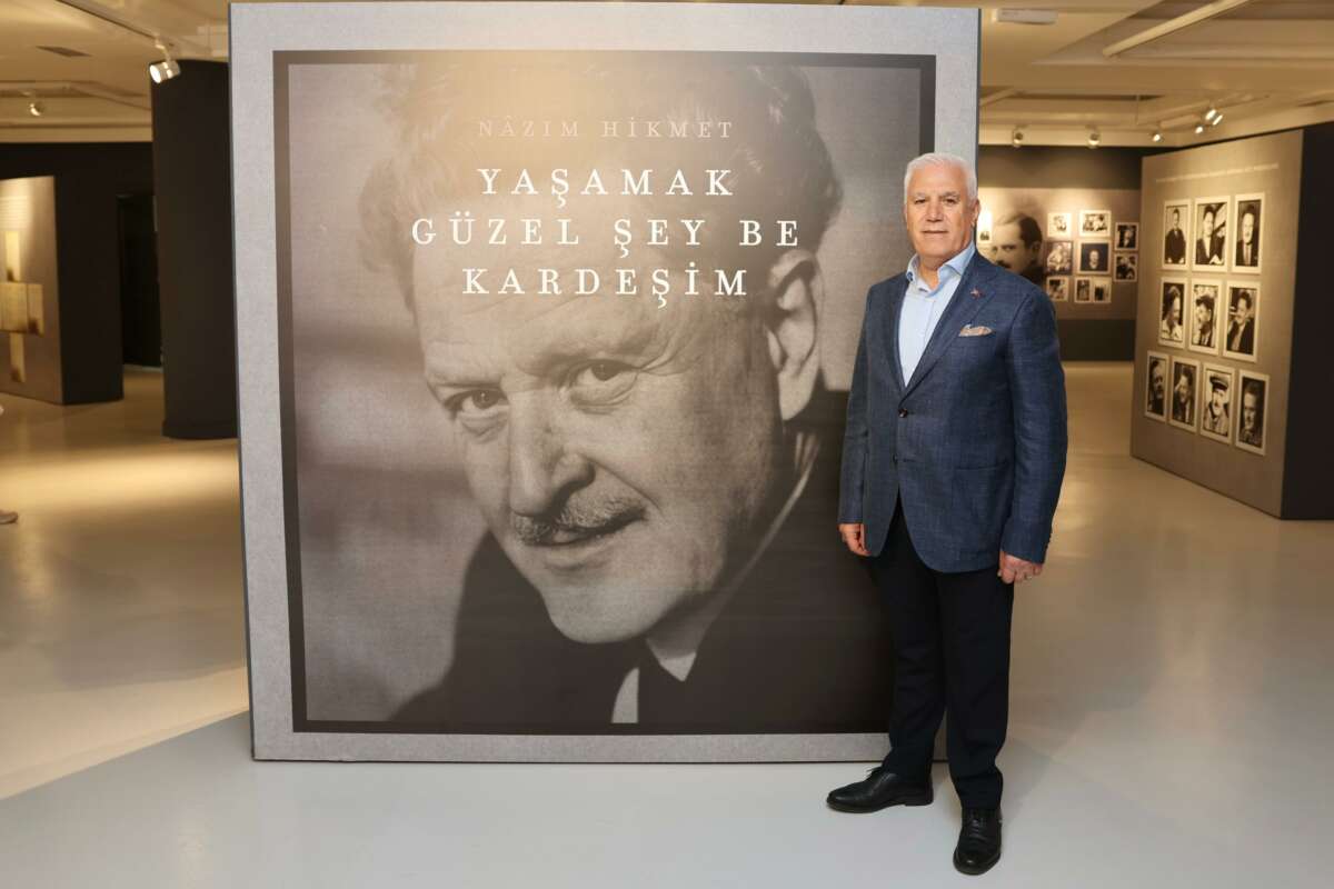 Bursa Büyükşehir Belediye Başkanı Mustafa Bozbey, ‘Nâzım Hikmet Yılı’ etkinlikleri kapsamında usta sanatçının yaşamından ve eserlerinden esinlenerek hazırlanan ‘Yaşamak Güzel Şey Be Kardeşim’ adlı sergiyi gezdi. Nâzım Hikmet’in çok yönlü sanat hayatına ve politik duruşuna odaklanan sergi, Emre Zeytinoğlu küratörlüğünde, Savaş Çekiç’in mekân tasarımı ve Nejat Biçen’in iletişim tasarımıyla hayata geçirildi. İki bölümden oluşan serginin Şefik Bursalı Sanat Galerisi’nde yer alan kısmı TÜSTAV, Nâzım Hikmet Vakfı ve Piraye Koleksiyonu’nun katkılarıyla hazırlandı. Sergide, Nâzım’ın şiirden tiyatroya, romandan sinemaya ve resme uzanan üretimleri, hayatına dair kronolojik bilgiler ve görsellerle birlikte belgesel bir anlatımla izleyiciye sunuldu. Serginin Tayyare Kültür Merkezi’ndeki bölümde ise Nâzım Hikmet’le düşünsel ya da duygusal bağ kuran sanatçıların eserleri yer alıyor. Eserlerin büyük kısmı Ahmet Merey Koleksiyonu’ndan oluşurken, Nâzım’ın yeğeni Ayşe Yaltırım’ın da aralarında bulunduğu dört sanatçının çalışmaları koleksiyon dışından eklenerek sergiyi zenginleştiriyor. Sergi, 9 Eylül 2025 tarihine kadar ziyaret edilebilecek.
