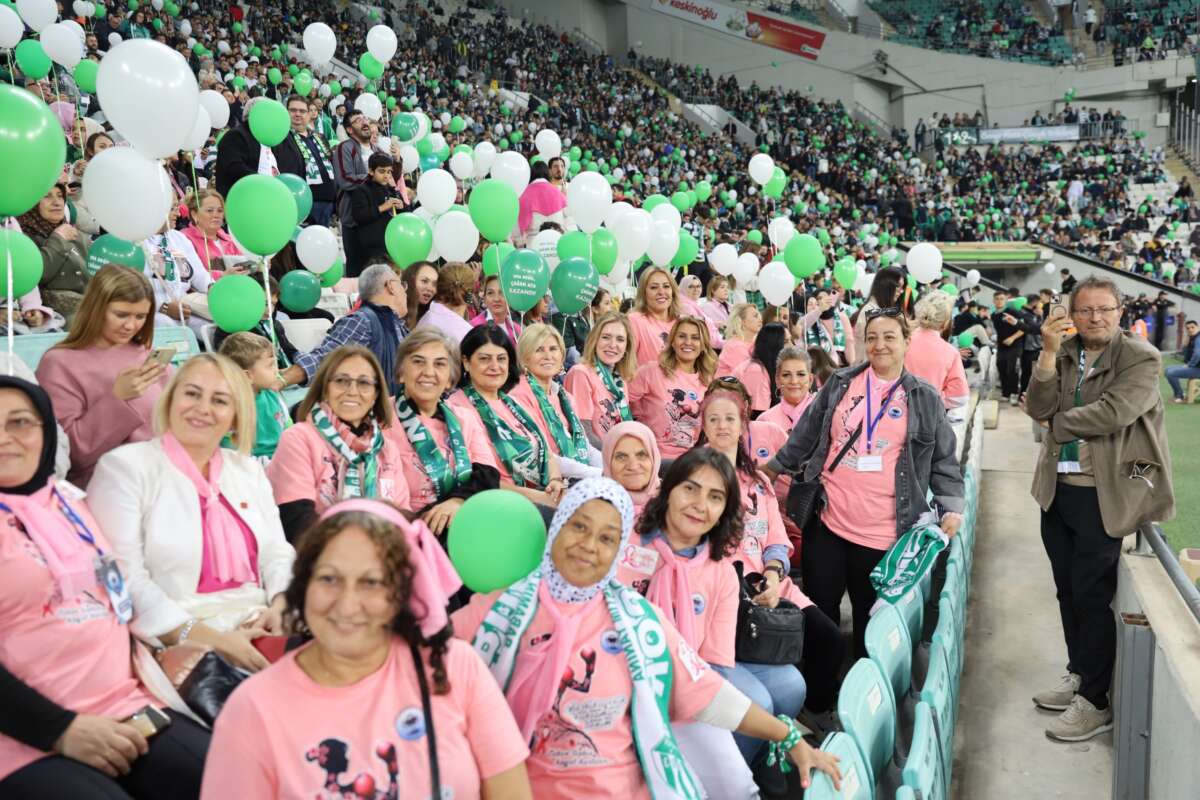 Bursa Büyükşehir Belediyesi’nin 1-31 Ekim Meme Kanseri Farkındalık ayı kapsamında, farkındalık oluşturmak amacıyla düzenlediği etkinliklerin bir yenisine Bursa Büyükşehir Belediye Başkanı Mustafa Bozbey’in eşi Seden Bozbey de katıldı. Bursa Büyükşehir Belediyesi’nin organizasyonuyla yaklaşık 100 kadın pembe tişörtleriyle Bursaspor Menemen Belediyespor maçını izleyerek farkındalık oluşturdu. Kadınlarla birlikte Bursaspor maçını tribünden izleyen Seden Bozbey, pembe kurdele takarak farkındalık mesajı verdi. Seden Bozbey, “Bursaspor Yeşilin İncileri Derneği ve Bursa Kanser Derneği işbirliği ile maçı kadınlarla birlikte izledik. Hem Bursaspor’u desteklemek hem de bu ayın farkındalığını artırmak amacıyla tribündeyiz” dedi.