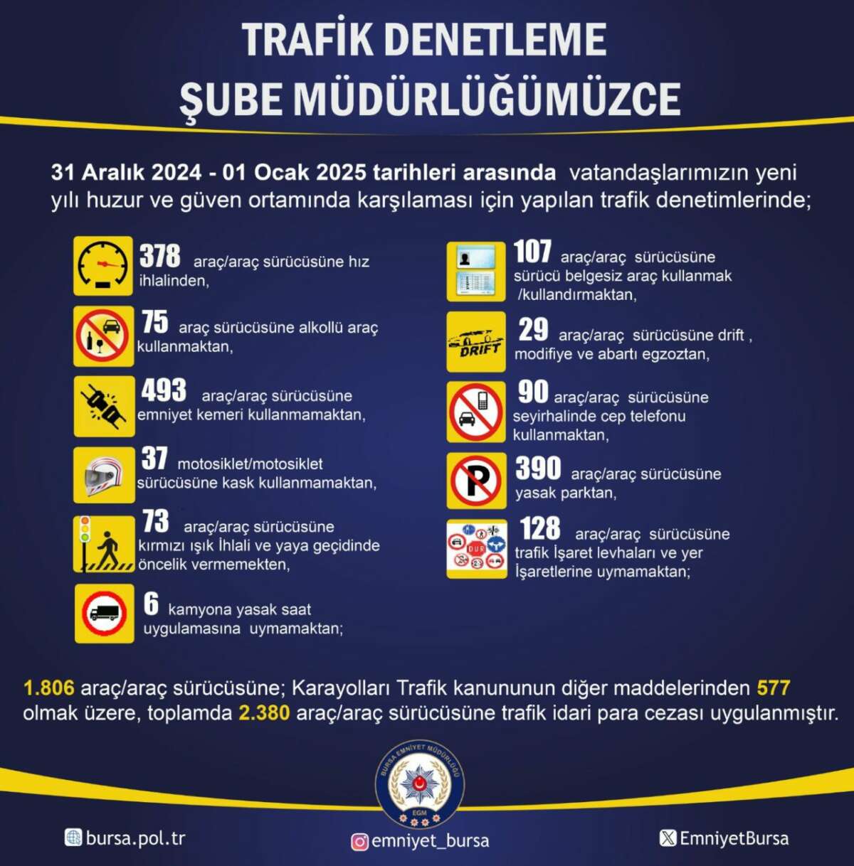 Bursa İl Emniyet Müdürlüğü Trafik Denetleme Şube Müdürlüğü ekipleri, yılbaşı süresince elektronik, sabit ve seyir halindeki denetimlerini artırarak, sürücüler üzerinde sıkı kontroller yaptı.