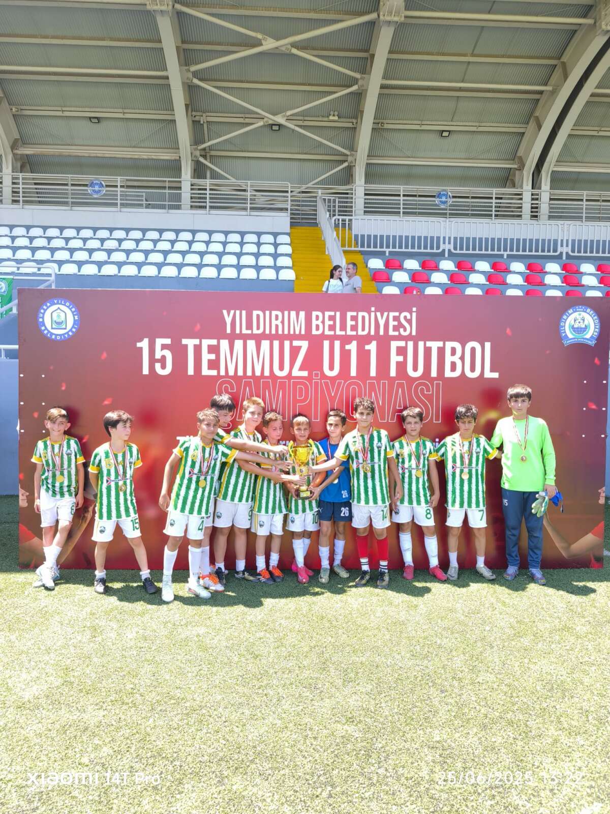 Yıldırım’ı sporda marka kent haline getirecek önemli yatırımları ilçeye kazandıran Yıldırım Belediyesi, gerçekleştirdiği turnuva ve şampiyonalarla da vatandaşları sporla buluşturmaya devam ediyor. 15 Temmuz Demokrasi ve Milli Birlik Günü haftası yaklaşırken, spor ve milli bilinci aynı sahada buluşturan Yıldırım Belediyesi, düzenlediği ‘15 Temmuz U-11 Futbol Turnuvası’ ile ilçede futbol şöleni yaşattı. Vakıf Bera Spor Tesisleri’nde düzenlenen turnuvaya 25 takım ve 400 sporcu katıldı. İki gün süren turnuva kıran kırana maçlara sahne oldu. Kardeşlik, dayanışma ve centilmenlik ruhu içinde geçen mücadelelerin ardından, normal süresi 2-2 biten final maçını penaltı atışlarıyla kazanan Bursaspor şampiyon oldu. Çağlayan Spor’un ikinci, Kestel Genç Yetenekler Spor’un üçüncü olduğu turnuvayı Fethiye İdman Yurdu ise dördüncü sırada tamamladı.