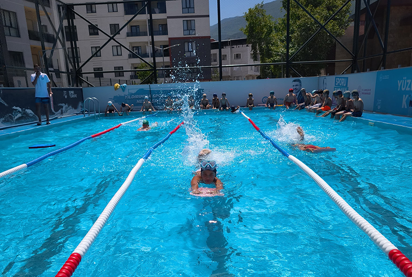 Yıldırım Belediyesi’nin, çocukların yaz tatilini dolu dolu geçirmeleri için başlattığı yaz spor okulları büyük ilgi görüyor. Modern, donanımlı ve hijyenik tesislerde; 18 farklı branşta verilen kurslarda eğitim alan çocuklar hem eğleniyor hem de spor yapıyor. ‘Yıldırım’da yüzme bilmeyen çocuk kalmasın’ hedefiyle hizmet veren Yıldırım Belediyesi yüzme kursları da en çok talep gören kursların başında geliyor. Naim Süleymanoğlu Spor Kompleksi, Yunus Emre Spor Kompleksi, Mimar Sinan Spor Kompleksi, Dr. Sadık Ahmet Gençlik ve Spor Merkezi, Karapınar Yıldırım Gençlik Merkezi ve Erikli Yüzme Havuzu’nda verilen kurslarda, 5-12 yaş arası çocuklar yüzme eğitimi alıyor. Haftanın 6 günü hizmet veren kurslara devam eden çocuklar, bir yandan yüzme öğrenirken bir yandan da sıcak yaz günlerinde havuzun tadını çıkarıyor.