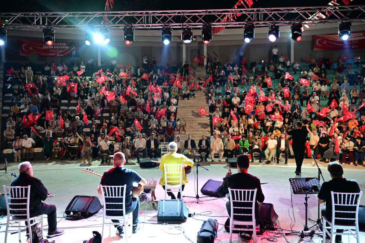 Türk Milleti’nin 30 Ağustos’ta iradesine boyunduruk vurdurmayacağını, istiklal ve istikbaline gölge düşürmeyeceğini bütün dünyaya ilan ettiğini söyleyen Başkan Yılmaz, “Gazi Mustafa Kemal Atatürk’ün sözleriyle 30 Ağustos Zaferi, “Türk Ordusunun, Türk subay ve komuta heyetinin yüksek kudret ve kahramanlığını tarihte bir daha belirleyen çok büyük bir eserdir.’ O gün atalarımızın yaktığı bağımsızlık meşalesi, bugün de aynı inançla, aynı heyecanla yolumuzu aydınlatmaya devam ediyor. Bu duygu ve düşüncelerle Cumhuriyetimizin kurucusu, Büyük Taarruzun Başkomutanı Gazi Mustafa Kemal Atatürk’ü, silah arkadaşlarını, bu toprakları bize vatan kılan tüm kahramanlarımızı, şehitlerimizi ve gazilerimizi rahmet ve minnetle anıyorum” ifadelerini kullandı. Daha sonra sahneye çıkan Türk Halk Müziği Sanatçısı Esat Kabaklı, seslendirdiği kahramanlık türküleriyle unutulmaz bir gece yaşattı.