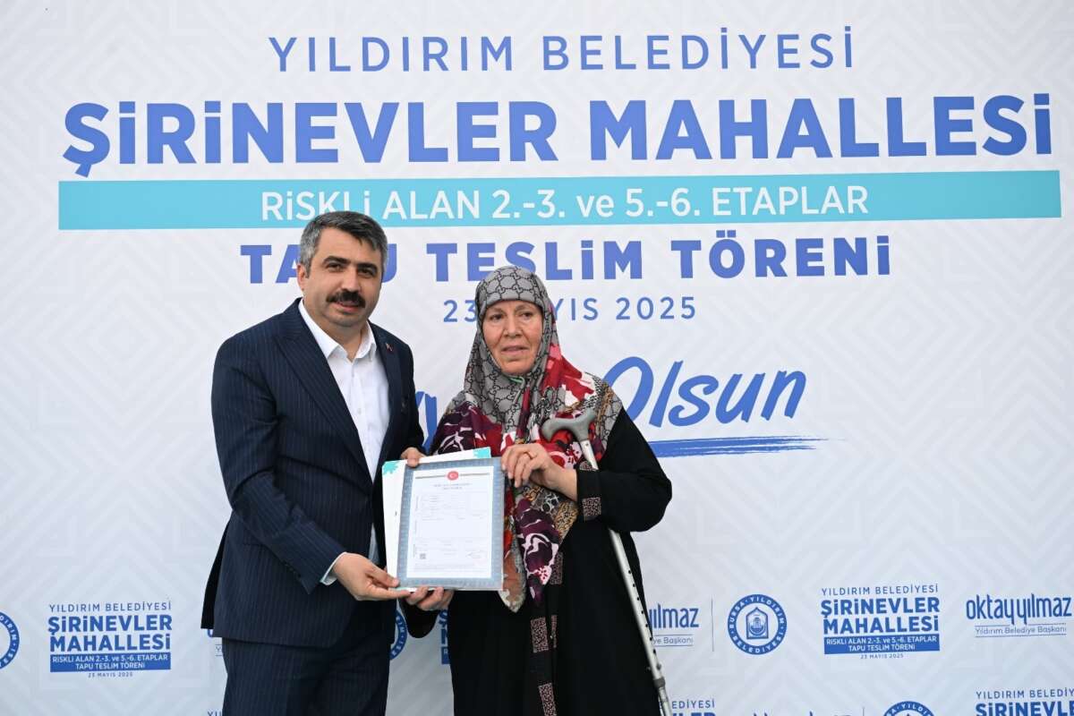 Yıllardır çözülemeyen mülkiyet sorunları, vatandaşlar için büyük bir belirsizlik ve mağduriyet kaynağıydı. Yıldırım Belediyesi, bu önemli soruna neşter vurarak, bugüne kadar tam 4 bin 166 vatandaşa tapularını dağıttı. Bu adım hem birçok ailenin yıllardır süregelen mağduriyetini gidermiş hem de mülklerin yasal güvence altına alınmasını sağlamıştır. Yıldırım Belediyesi tapu dağıtımı, Arabayatağı ve Çınarönü gerçekleşti. Tören, Barış Manço Kültür Merkezi’nde Belediye Başkanı Yılmaz, Ak Parti Yıldırım İlçe Başkanı İrfan Akkaya, AKP ve MHP il yöneticileri ve hak sahipleri katılımlarıyla gerçekleşti.